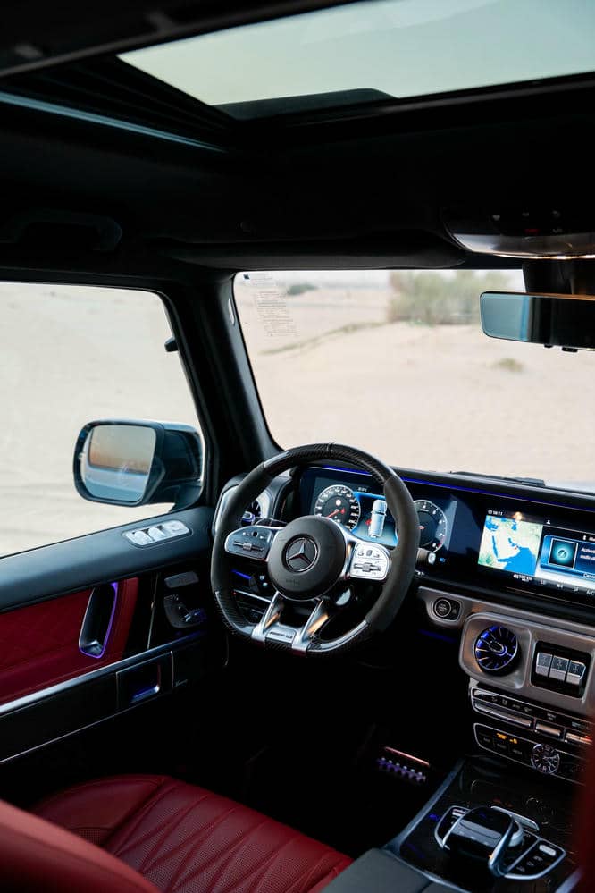 Step inside, and the G63 4×4² transforms from a beast to a sanctuary of luxury. The hand-stitched Nappa leather seats, AMG carbon-fiber trim, and ambient lighting create an interior that’s both elegant and imposing. The high driving position offers a commanding view of Dubai’s skyline, while the dual 12.3-inch digital displays put cutting-edge technology at your fingertips.